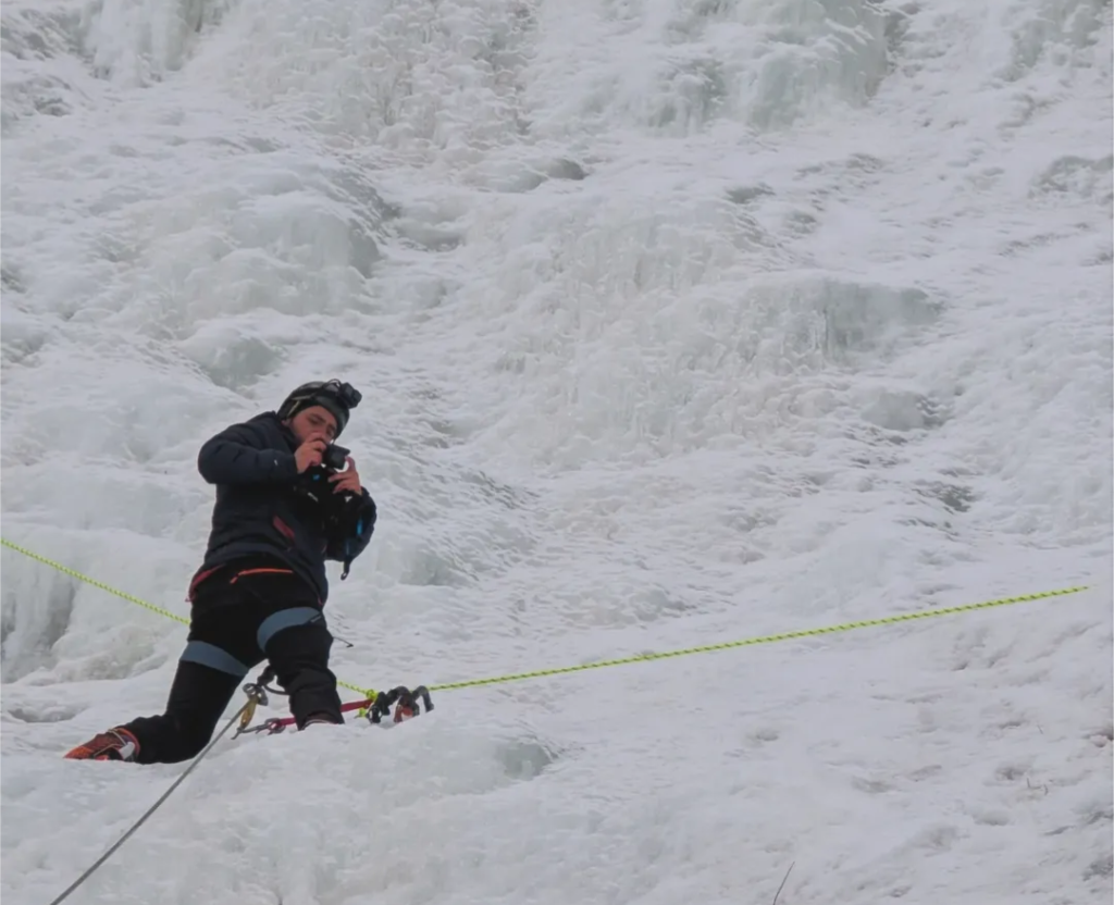 Cette année, ce sera l’escalade de glace. Le coup de foudre est immédiat. En sortant d’un canyon, piolet à la main, une sensation étrange l’envahit, un peu comme s’il venait d’entrer dans un film d’alpinisme. L’envie d’aller plus loin s’installe.
