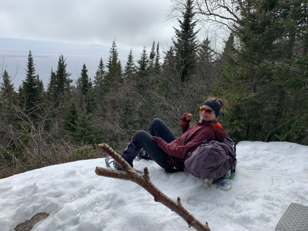 Comme ma famille et moi, elle traverse alors les Monts-Valin en raquette, un itinéraire d’environ 30 kilomètres au sein d’un magnifique massif montagneux du Saguenay. Nous nous croisons dans un refuge, où nous passerons la nuit en compagnie d’autres randonneurs, avant de reprendre la route le lendemain.